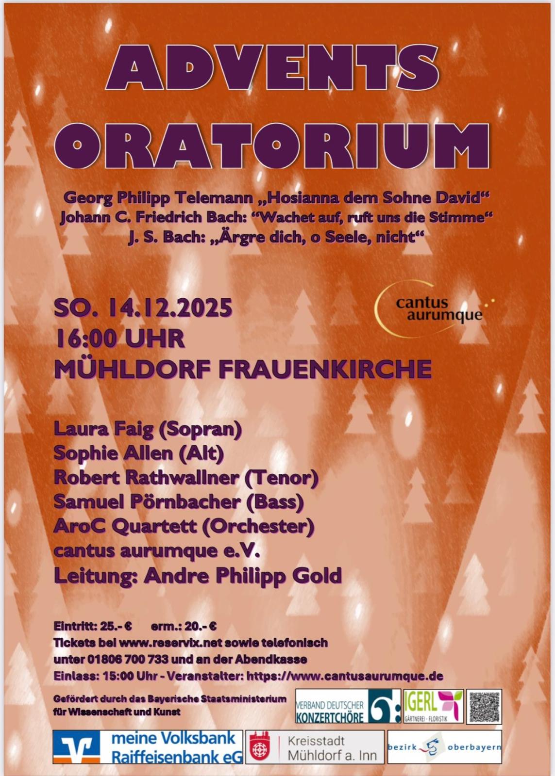 Am Sonntag, den 14.12.25, um 16Uhr präsentiert das AroC Quartett gemeinsam mit dem Chor cantus aurumque e.V. ein Adventsoratorium in der Frauenkirche in Mühldorf unter der Leitung von André Gold